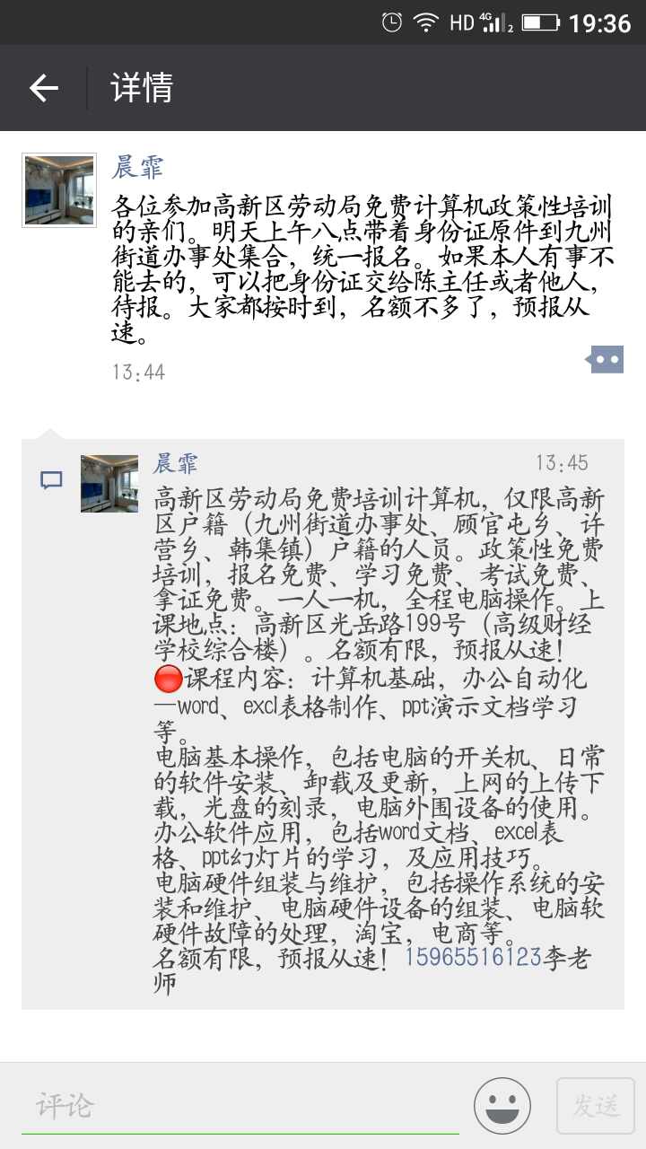 劳动局免费培训电脑,而且学校就在离家一个红绿灯路口的距离,有我们社区户口的都可以免费学习,学习时间自己选择,一个时间段两个小时而已,和老公说了,他说什么都不让去,就让在家休养,可是我觉得这应该不会多累,就当去玩了,顺便学习学习,哎!明天就要去报名了,我是偷偷去,还是不去呢?