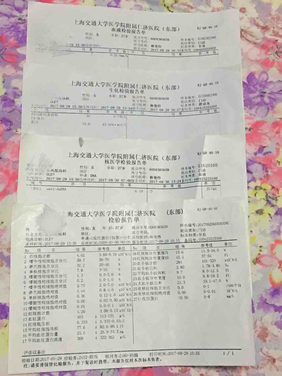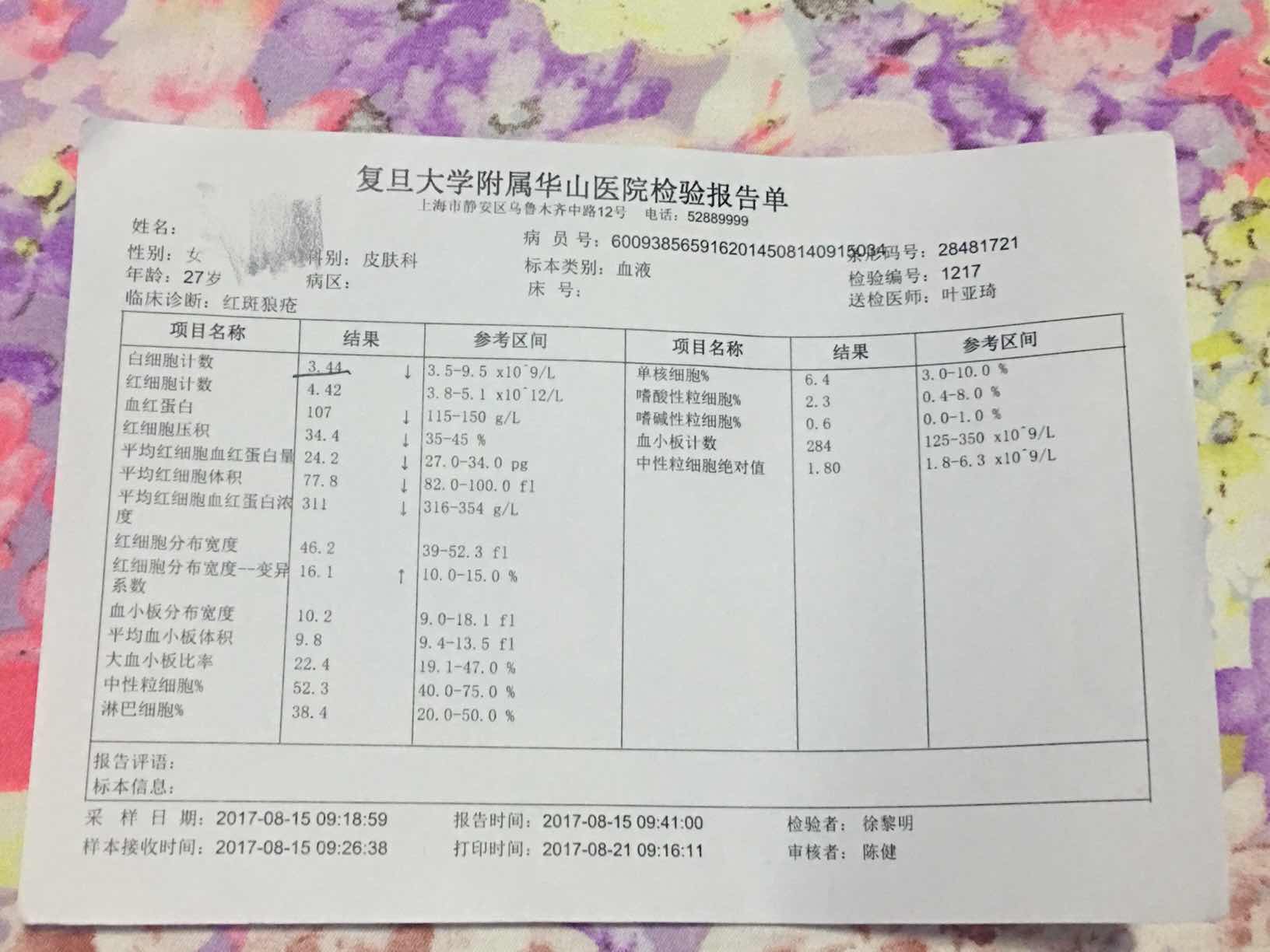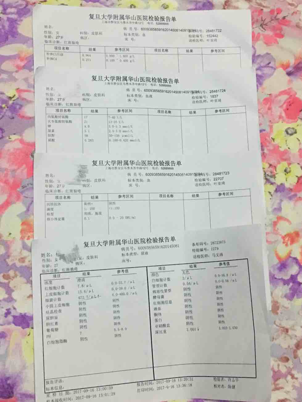 明天约了下午去复查,8月和9月都有检查,担心每个月抽血检查对身体不好,希望能少点检查。这么多的数据,想问问哪些比较重要,我想标记出来自己做个图表,总结经验。图一和二是8月份做的,因为例假最后一天做的尿检有隐血和尿蛋白,医生让复查,9月份补了一个。图二是9月底做的检查。这次在两个不同的医院做的。头皮上的红斑一直都还没退,头发也长不起来。油性头发,不洗头就难受,前几天掉头发厉害,都不敢洗头不敢挠头。目前一直是早晚各一片芬乐,早中晚两片复方甘草酸苷片。