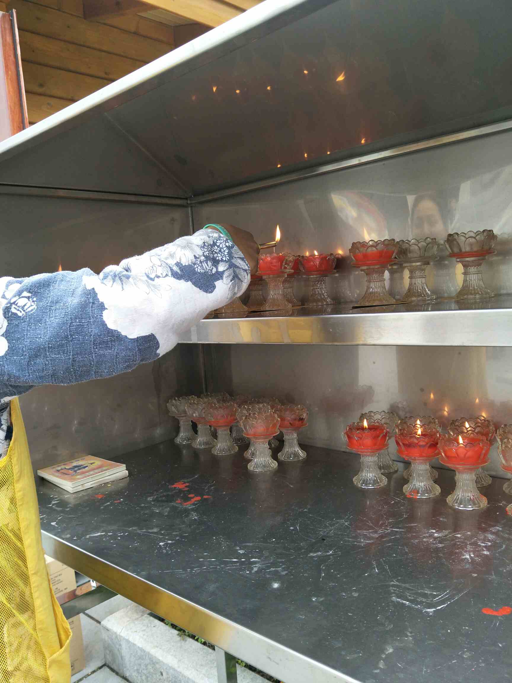 还有呐,还有点灯。我就去了,然后那个人,哎,见我拿钱的时候有两张50的,然后,她就说跟我换下,她也要点灯,我看今天是观音旦,都是心意,就同意了,没多想,然后,我两张50的都给她了,她拿一张100的出来,投进去箱里了,然后,没给我钱,我也没反应了,就带我去点灯了!点完,我在回到那个位置,多拿两瓶水,在添了香油钱,就走啦,回家!