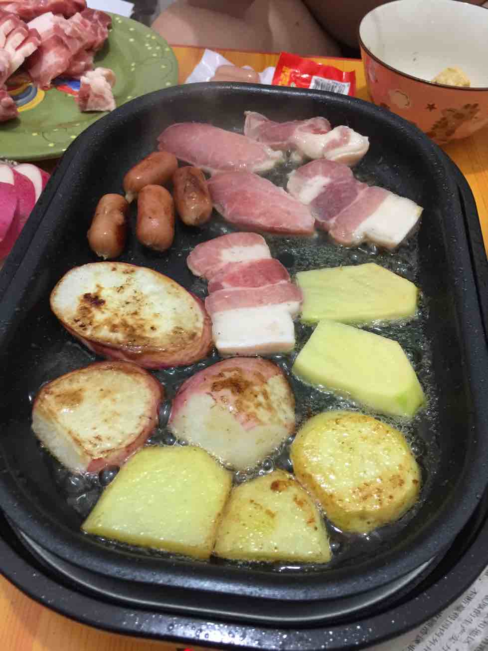 火急火燎的回家,临时回来都不知道给他吃什么,洗了个土豆,萝卜,切盘五花肉,烤肉吃。