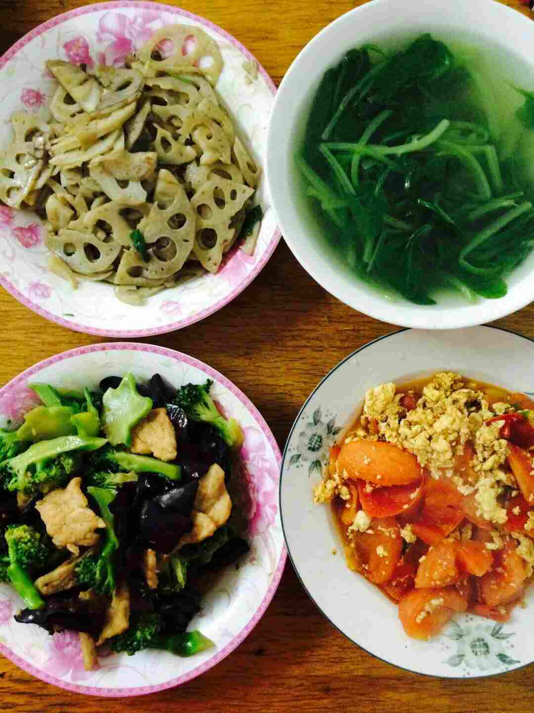 今天午饭补发一下吧,藕片,西兰花肉片木耳,青菜汤,西红柿炒鸡蛋,很好吃