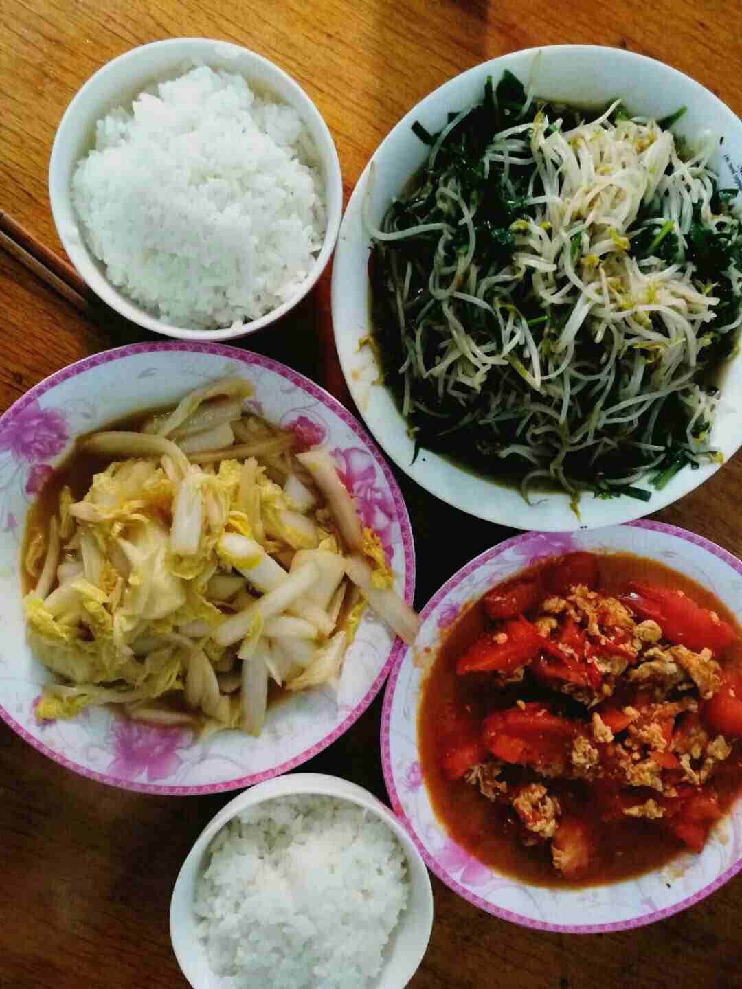 今天午饭,西红柿鸡蛋,白菜,韭菜豆芽。