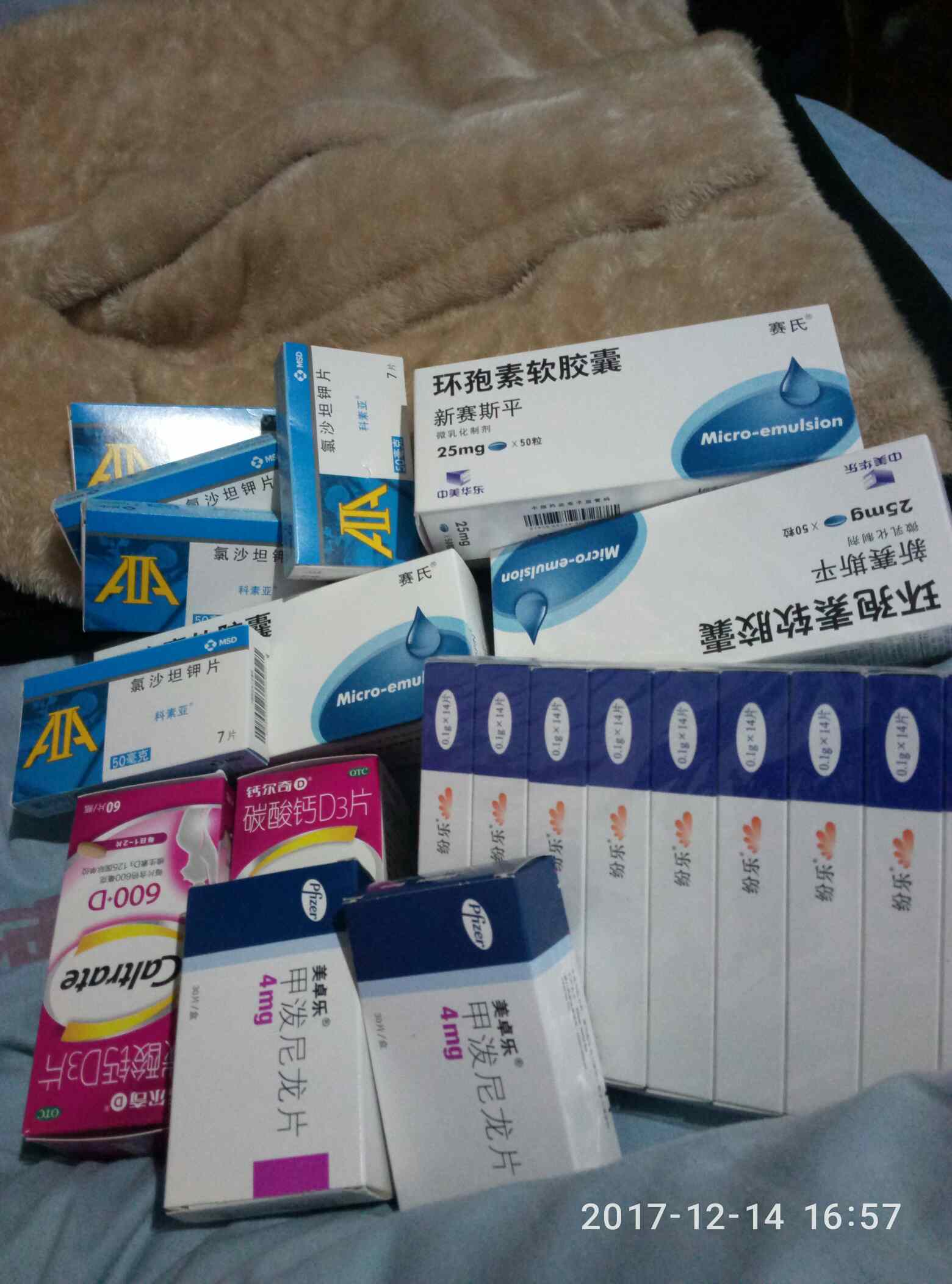 ,加上原来每个月2盒美卓乐,10盒纷乐,一大盒钙尔奇,这次一共花了1234块,报销了500,所以花了734块钱,比上个月多花四百多块