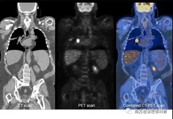 PET扫描:在这个检查中,一种名为FDG的放射性糖被注入血液中。因为体内的癌细胞生长很快,它们比正常脏器能吸收更多的放射性糖。这种放射性可以用特殊的照相机来观察,吸收糖比较多的部位在检查时呈现出高亮区域(医学术语叫做高代谢、高SUV值)。