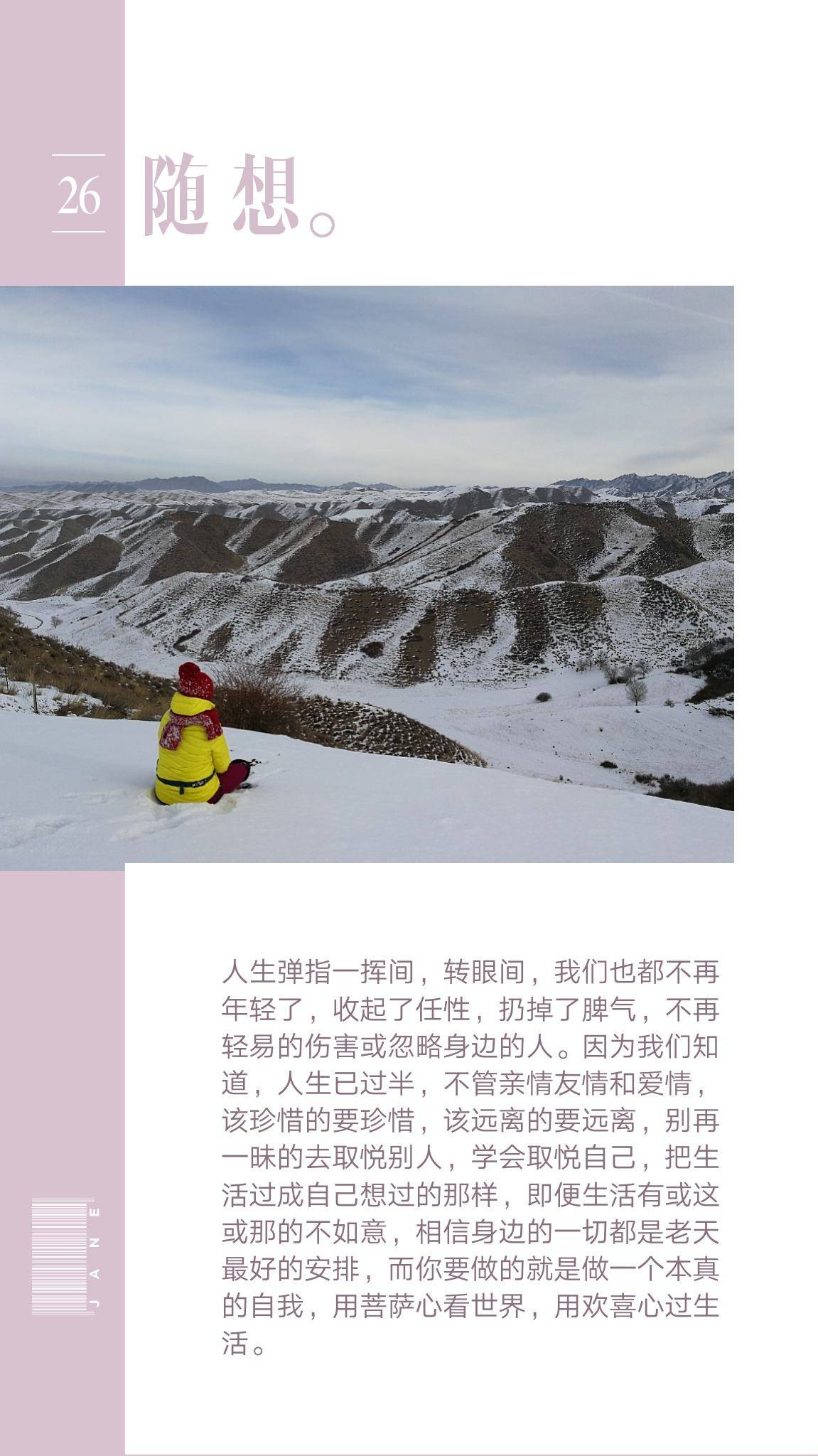 人生弹指一挥间,转眼间,我们也都不再年轻了,收起了任性,扔掉了脾气,不再轻易的伤害或忽略身边的人。因为我们知道,人生已过半,不管亲情友情和爱情,该珍惜的要珍惜,该远离的要远离,别再一昧的去取悦别人,学会取悦自己,把生活过成自己想过的那样,即便生活有或这或那的不如意,相信身边的一切都是老天最好的安排,而你要做的就是做一个本真的自我,用菩萨心看世界,用欢喜心过生活。
