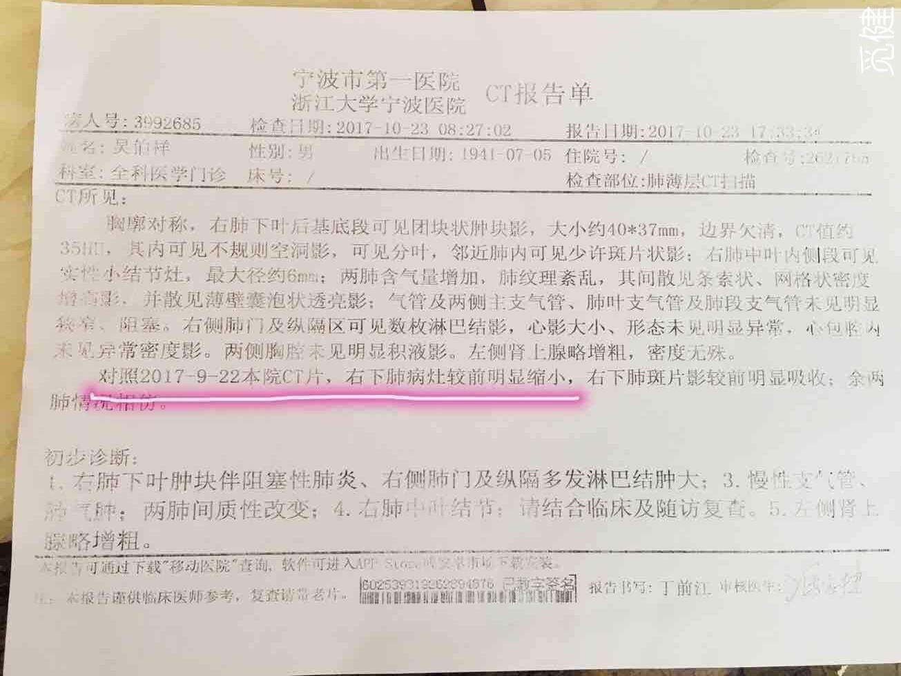 也给了我好几个方案建议、这次第九针继续打、打后半个月再检查、如果再继续增大就立马卸掉O!现在基本定了考虑换T或者I再赌一把PD-L1之路!放化之路不会考虑!我知道大家都在期待我的第二次评估单的分享、这次真对不住了!分享几张上次和这次的报告单、供大家参考!另外各位觅友还有陈医生对我家老豆子有什么好的后续治疗宝贵建议麻烦也给我分享下、感谢