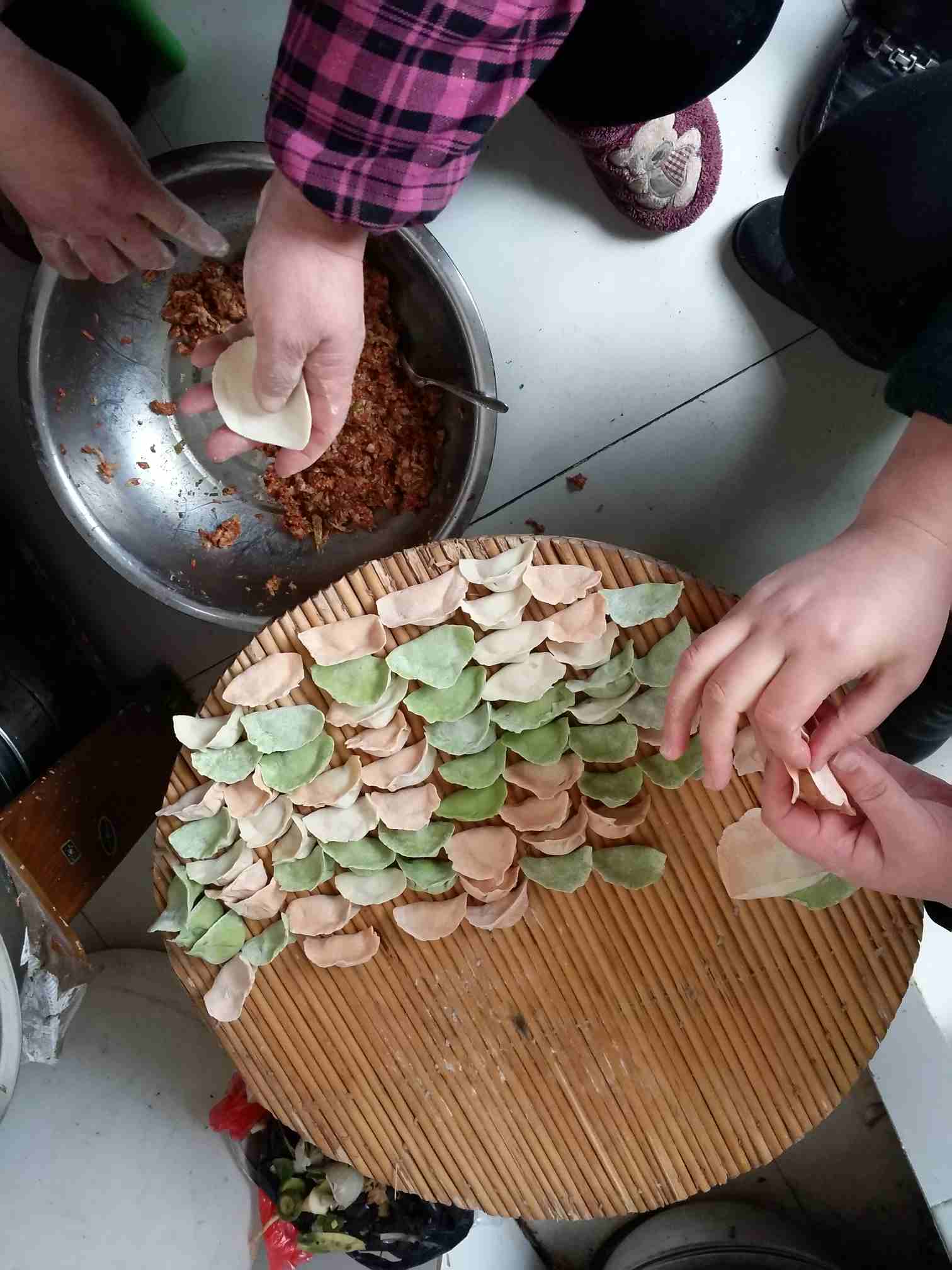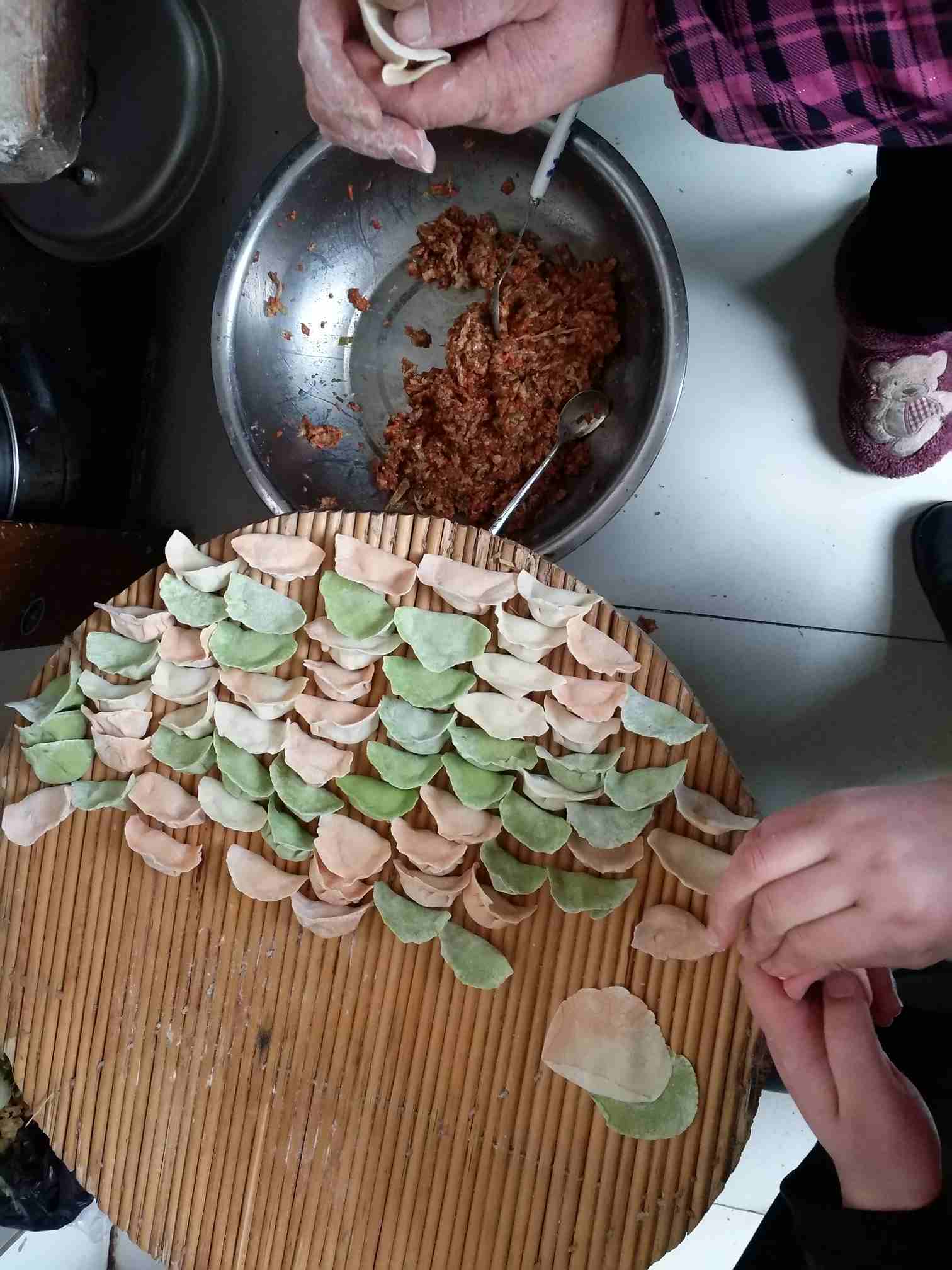 今天周末,和妹妹商量好今天去妈妈家,给妈妈包饺子,妈妈今年59,我们这有这个风俗,奔60之前吃饺子免灾,我和的馅子买的猪肉,妹妹买的面粉,她从家里榨好的胡萝卜汁,菠菜汁,我们一起和面,一起给妈妈包59个饺子,放在一边,
