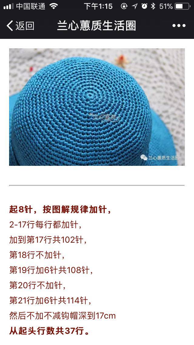 我是一针短针中钩七针短针,圈起来。之后每圈加七针,直到钩够帽顶,再继续不加不减钩帽深,钩到眼眉处,再钩帽沿,每圈加七针,别总在一个地方加,会加出尖,钩到自己想要的大小。