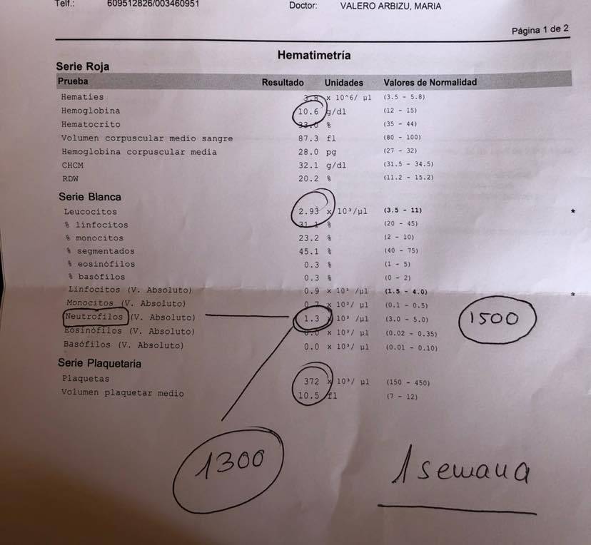 医生:不需要吃药,可能是你24号验的血,有点早,今天27号,那几天可能白细胞值就是低。下回别这么早验血了。(注:欧洲这里不需要每周去医院报道,就是到你化疗前几天,拿着医生提前开好的验血单子就近去任何一家医院直接验血就好了)医生接着说,下礼拜五早上8点,直接来这边化疗室验血,10点取报告后,合格就可以安排化疗了。