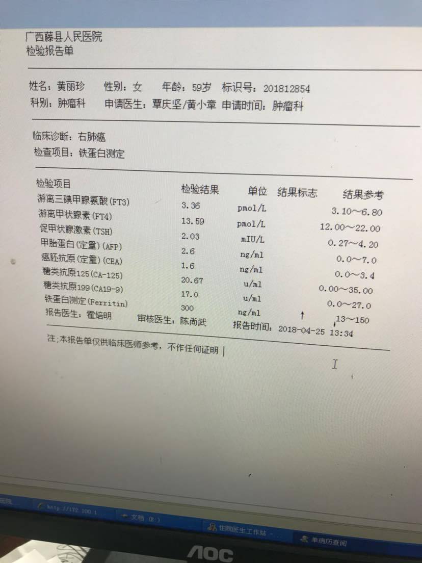 易瑞沙啥时候开始吃的,当中什么时候停的,什么时候恢复的,现在是否还在吃!病人现在状态怎么样!如果还在医院的话,再抽管血,做个肿瘤标志物,铁蛋白,细胞角蛋白19片段,CEA!你先不要急,急了又要出错!