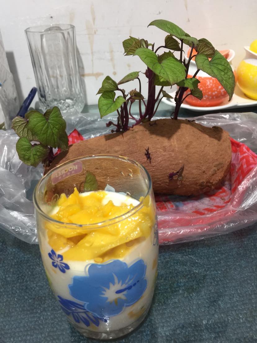 杯子后面的盆栽,用番薯养出来的,放桌子上,蛮好看。。