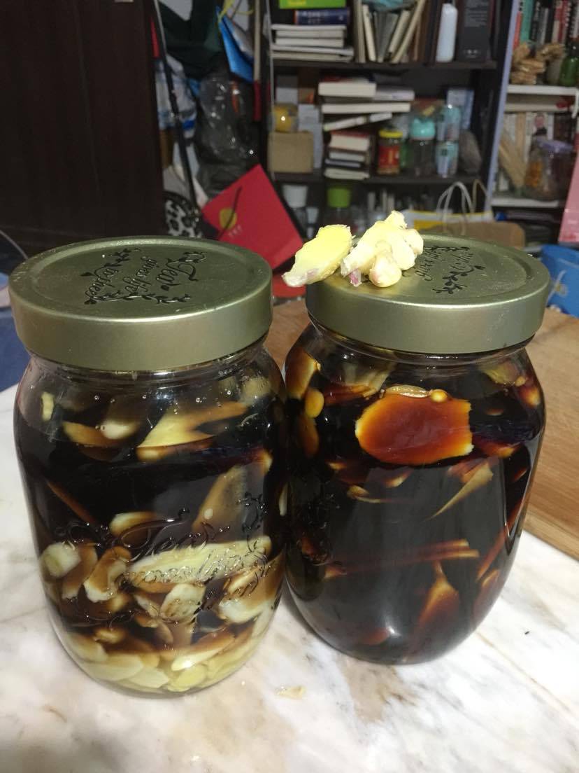 今晚五斤嫩姜,做了一瓶糖醋姜,一瓶酱油姜,还熬了一锅肉酱。。