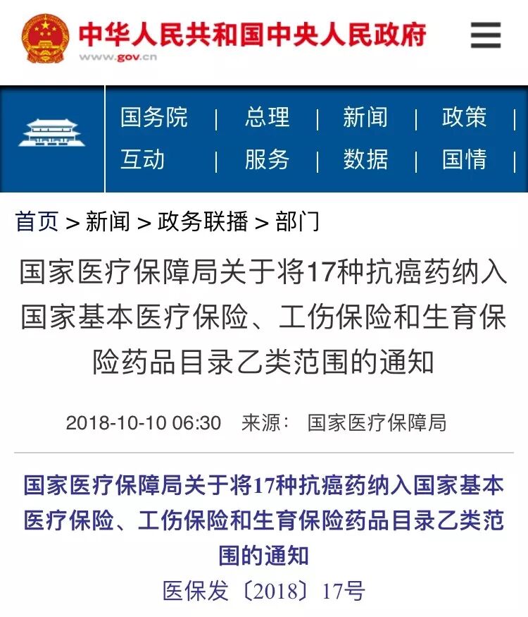 2018年10月10日,国家医疗保障局印发了《关于将 17 种药品纳入国家基本医疗保险、工伤保险和生育保险药品目录乙类范围的通知》。