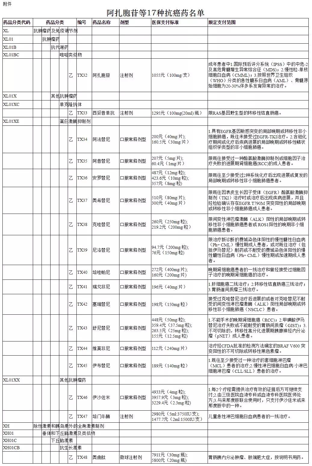 17种入医保抗癌药名单如下: