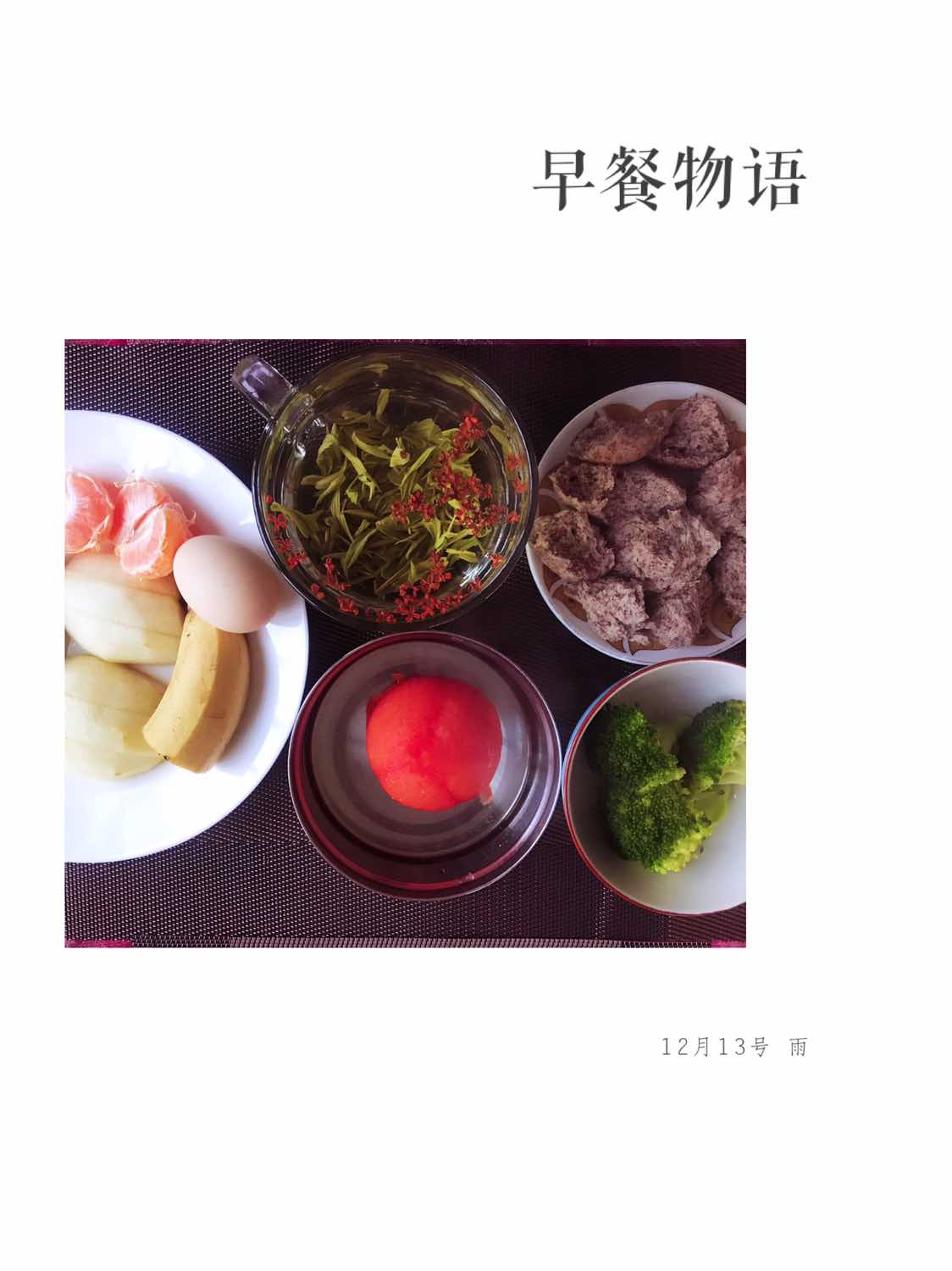 黑麦馒头,桂花绿茶🍵,橘子🍊,香蕉🍌,香梨🍐,水煮鸡蛋,蒸西兰花🥦、蒸番茄🍅