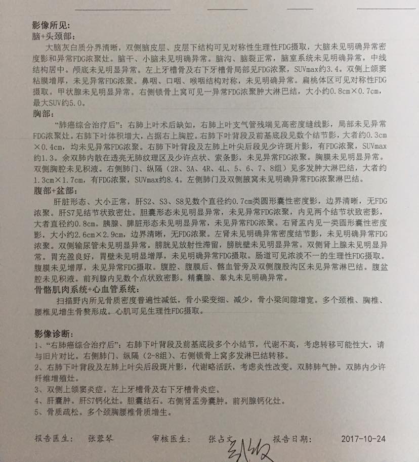 原本计划复查没事第二天就飞回三亚了,结果当天就取消回来的航班,教授建议做个PET-CT看一下是否有别处转移病灶,但是中山肿瘤医院的要预约到两周后才能排上号,随后教授也联系了他的朋友,让我们去第六医院做,上午做,第二天就出结果了,结果显示没有其他脏器的转移灶,转移部位还是在肺部