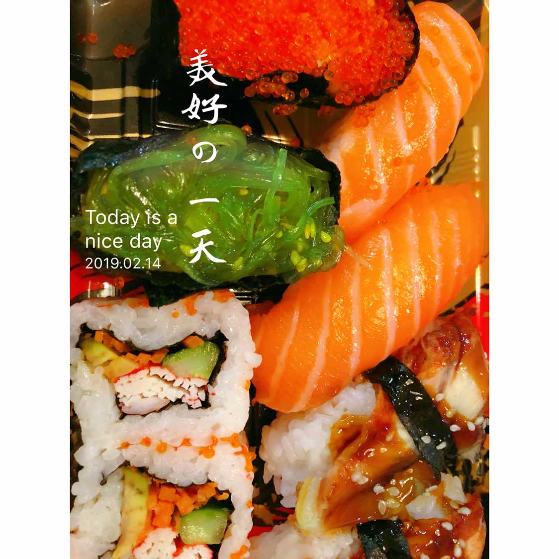 为了表示没有玫瑰,但是要有胃,给我买了最爱的寿司卷,哈哈,我跟他说嫁对了人每天都过情人节,他说嗯,咱不拘泥今天过。😄