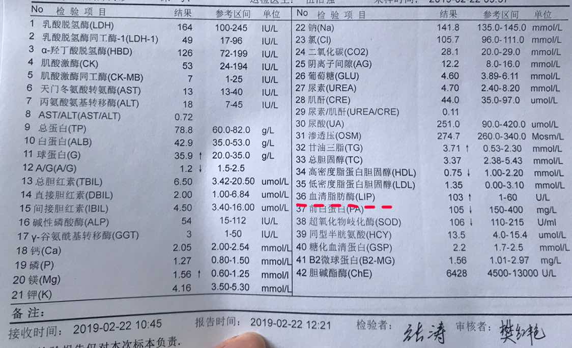 临化全项里有一个血清脂肪酶,超标有点厉害,准备明天问问大夫,不知道有没有觅友知道这个。