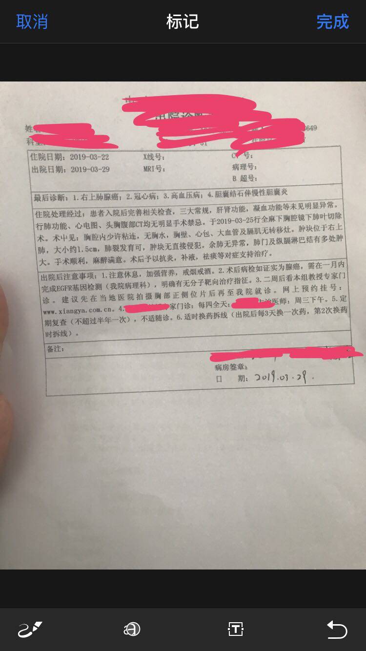 小病理肯定作了,不然怎能确疹为腺癌。出院后待下次复查时作个CT,看肺门淋巴结肿大是否消除,是不是因炎症引起的。至于术后能否转移谁也说不准,因各体差异及其多种因素在每个人身上是其结果都是不一样的。待基因捡測结果出来在确定下步治疗方案。