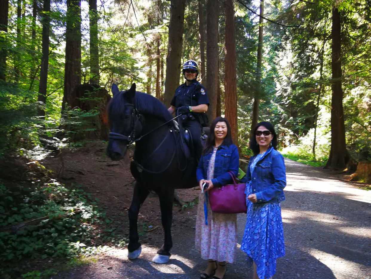 公园里花还不多,但空气清新,环境优美。 朋友的眼睛也恢复的差不多了,心情舒畅了不少。 边走边聊,我们都有了好心情。 路上遇到骑警,我问“可以照相吗”? 那警察很愉快地说“当然没问题啦”。 老公感紧给我们照相,警察很帅,那马也很漂亮😍😍😍。