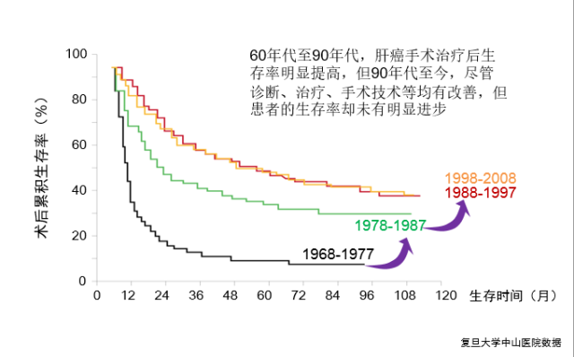 但在中国,实际上医生们更多地依赖于临床经验而非循证医学,不论病人处于哪一肿瘤分期,根治性切除手术都是重要的治疗方式。广撒网型的手术治疗很可能可以解释为什么90年代以来,尽管诊断、手术技术都有改善,但患者的生存率却未有明显进步的问题。