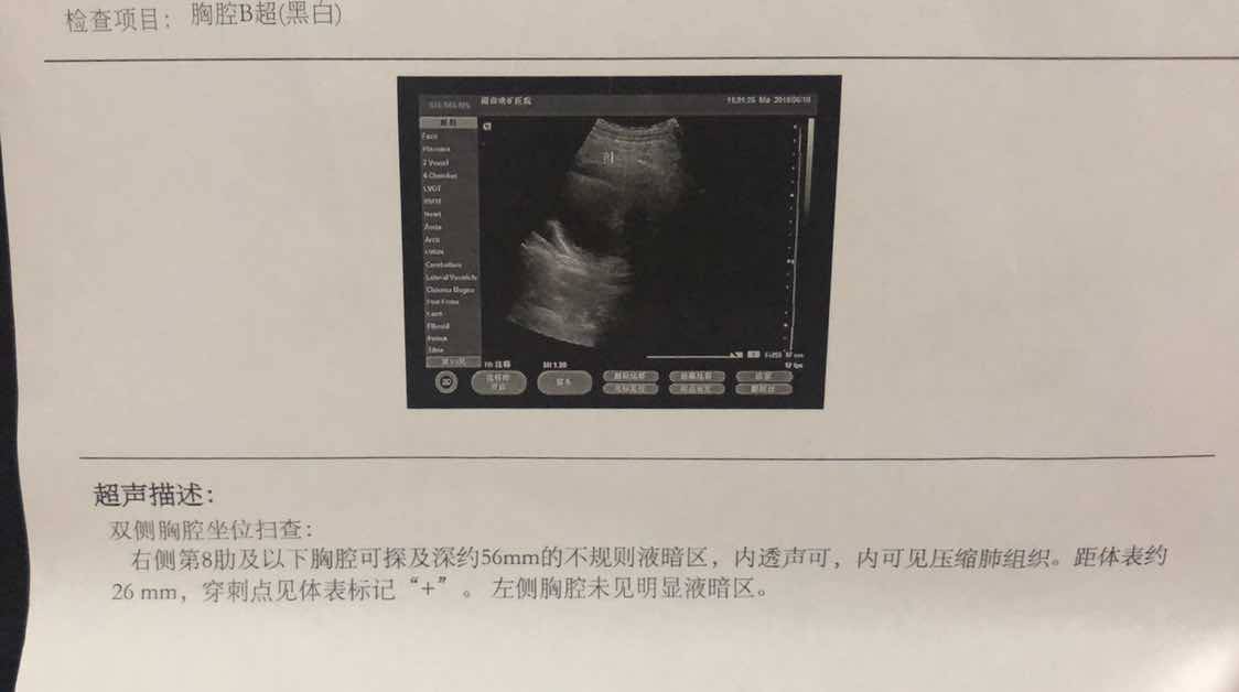 5/27日ct复查发现胸腔积液,b超查看定位有右侧52mm深液暗区,插引流管导出近600ml积液,5/29b超检查无积液后拔管。