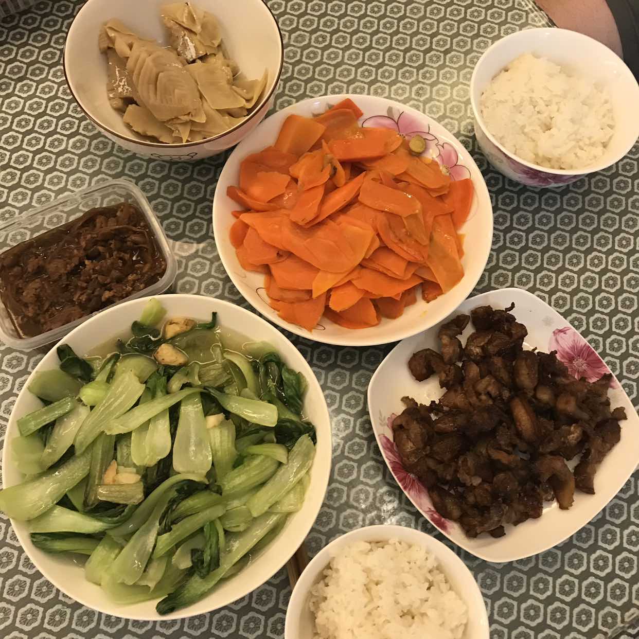 晚上到家,饭焖上,就倒沙发上睡了,等他回来才起来做了菜。刚准备吃,来了朋友,聊到九点半才走。等他们走了,我们两才吃上这晚饭。。今天吃得很素,一碗咸笋,胡萝卜,青菜,嫩姜焖酱,嫌素,他又烤了一盘肉。。他吃了两大碗。。