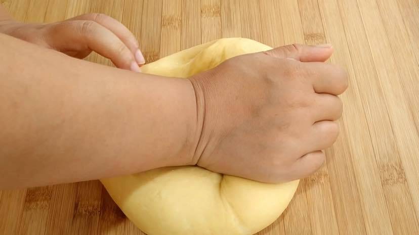 7.面饧发好了,放到面板上用手揉搓排净里面的气体。