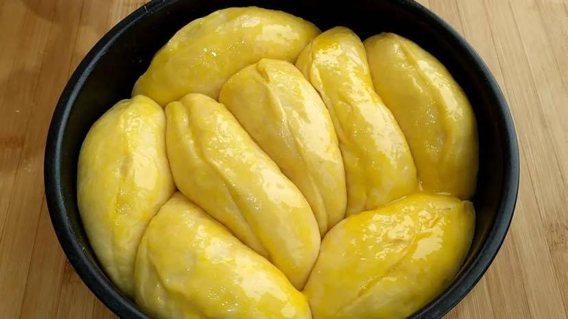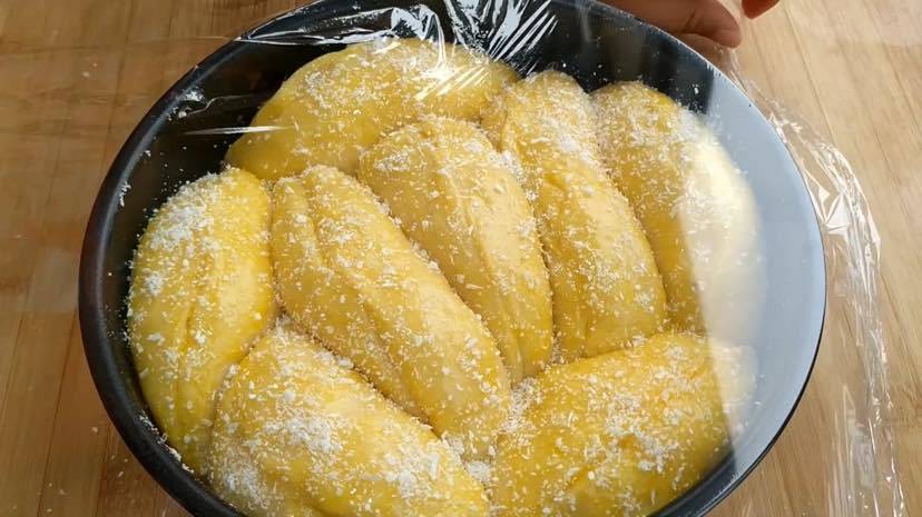 11.我们另取一个碗倒入一个蛋黄,搅散刷在面包生坯上,再撒上椰蓉,盖上耐高温的保鲜膜,凉水上锅,开大火上锅蒸40分钟,时间到关火焖5分钟。