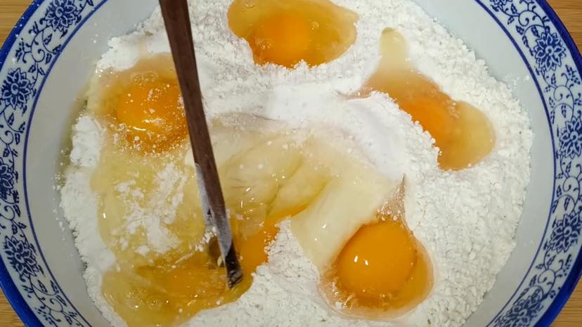 3.盆里倒入450g面粉,加入4g盐,4g酵母粉,30g白糖,再打入5个鸡蛋。