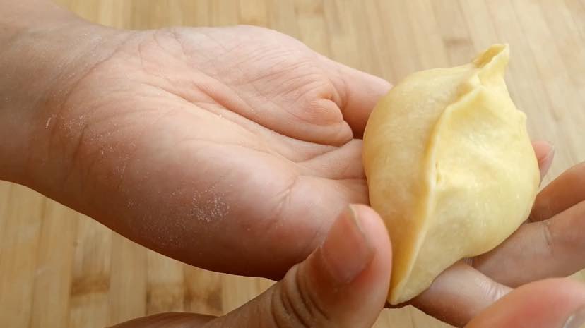 9.面板撒上干面粉,把面剂用擀面杖擀成圆饼状,不要擀的太薄,放上1勺绿豆馅料,用手捏合封口,像这样就可以。
