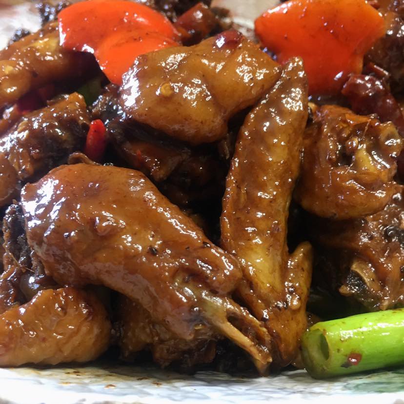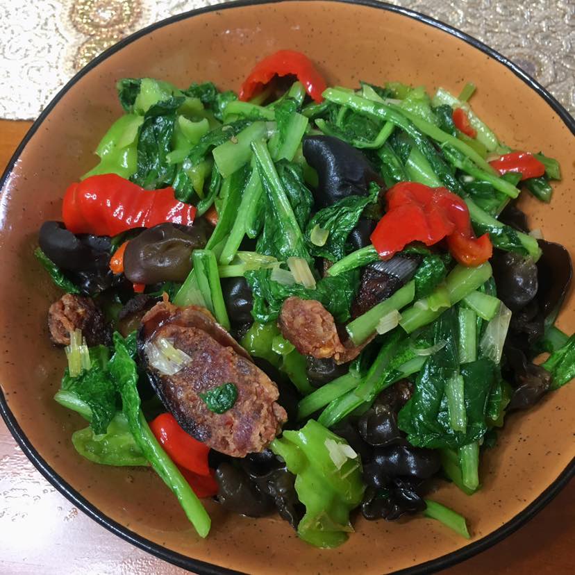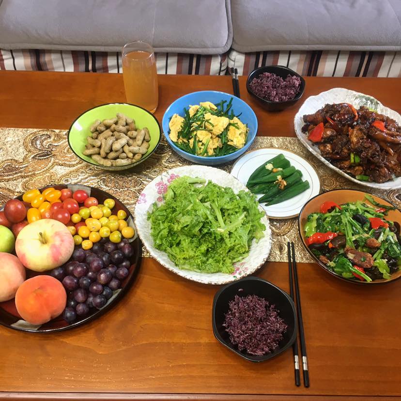 晚餐:红烧辣子鸡/凉拌生菜/韭薹炒鹅蛋/腊肠炒木耳小白菜青红椒/秋葵/水煮新花生/山楂水