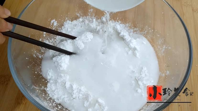 5.碗里倒入110g豌豆淀粉,倒入150ml清水搅拌均匀。