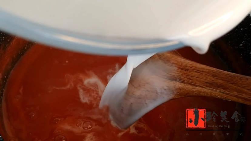 7.淀粉水充分搅拌一下,因为淀粉很容易沉底的,倒入熬开的西红柿锅里,一倒一边搅拌。