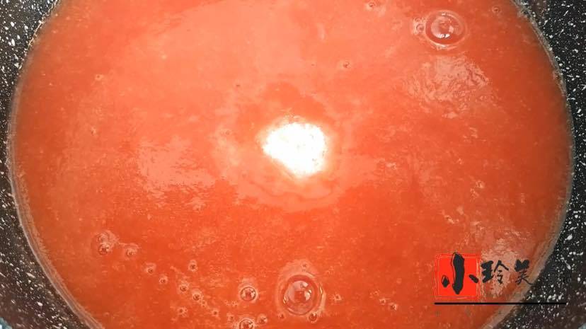 6.把打好的番茄汁倒入不粘锅里,加入50g白糖,喜欢吃甜的可以多放点白糖,我做的是微甜的,开小火慢慢熬煮。