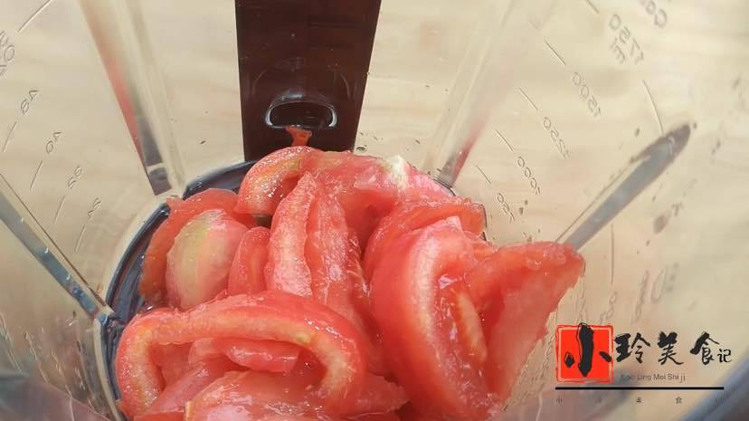 4.西红柿的根部用刀挖出来,切成小块,放到料理机里打成番茄汁,我用4个西红柿打出来的番茄汁正好是550ml。