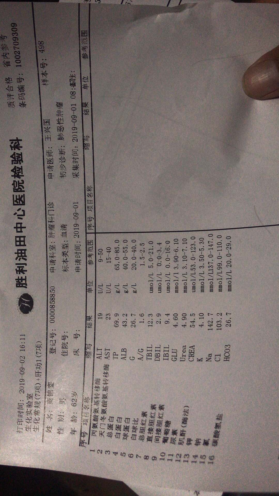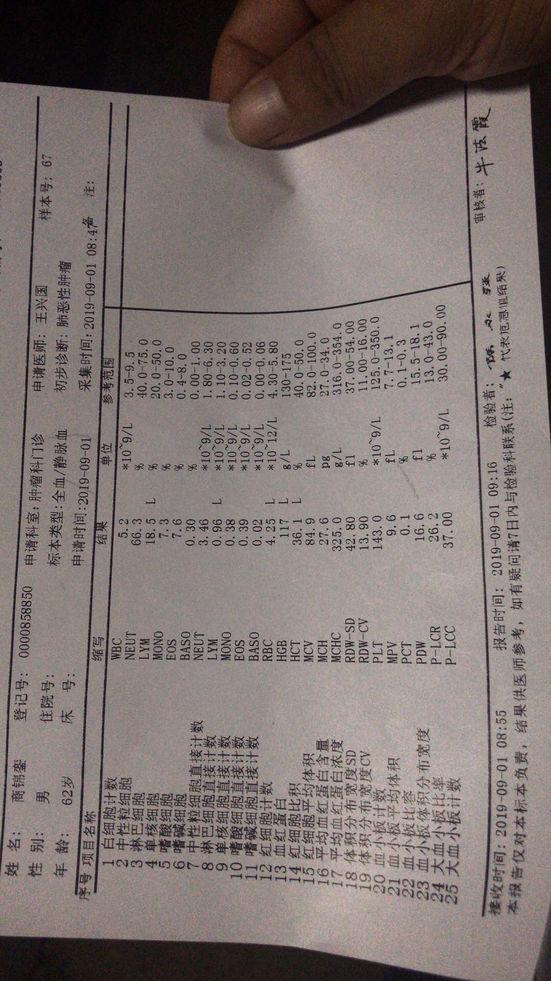 9291一个月后的血液复查,大家帮忙看一下缺啥,打算食补,医生说免疫力低,胃口比吃易瑞沙的时候好很多,医生说效果很好,就相当于拳头跟硬币的比例,希望越来越好