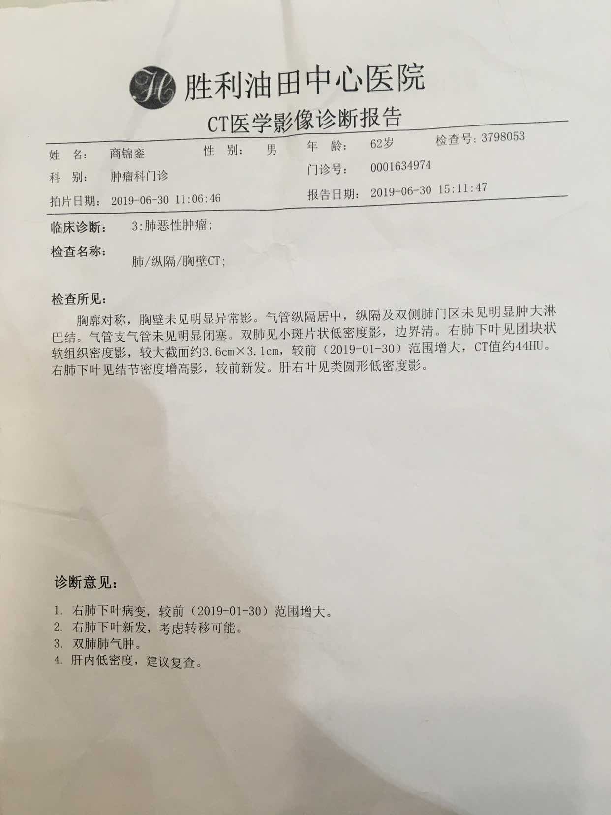 父亲一代易瑞沙17个月后再次基因检测,万幸有790突变,19突变,也纠结过要不要选择肺部放疗,或者化疗,最终选择了三代靶向药,拿到复查结果的哪一天纠结的心才放下,三代药真是神药,威武霸气,上图