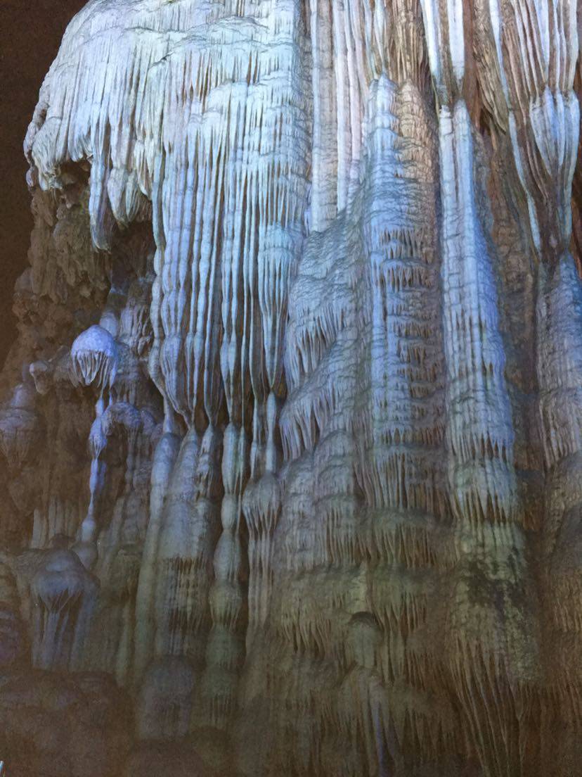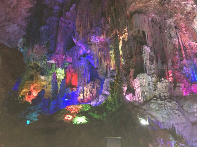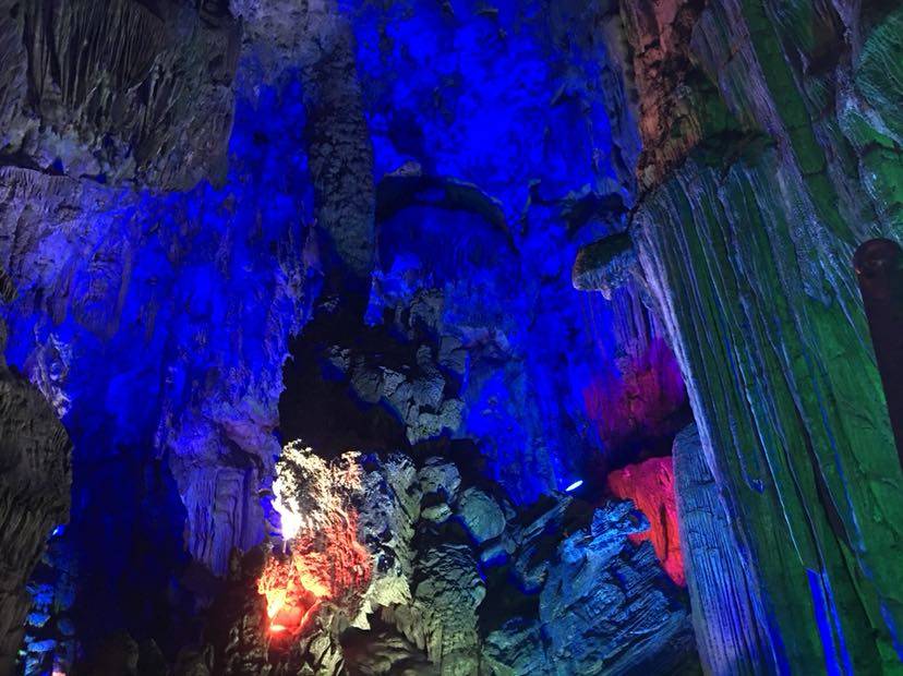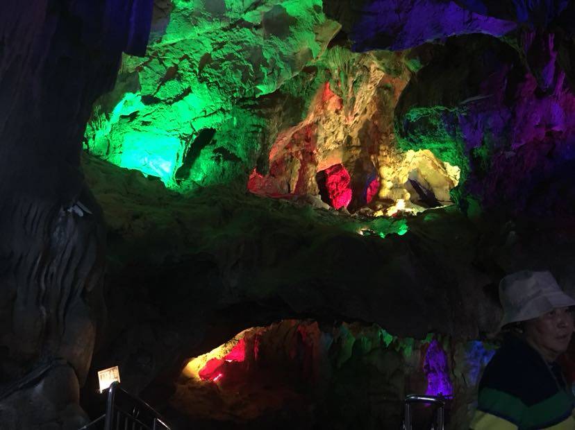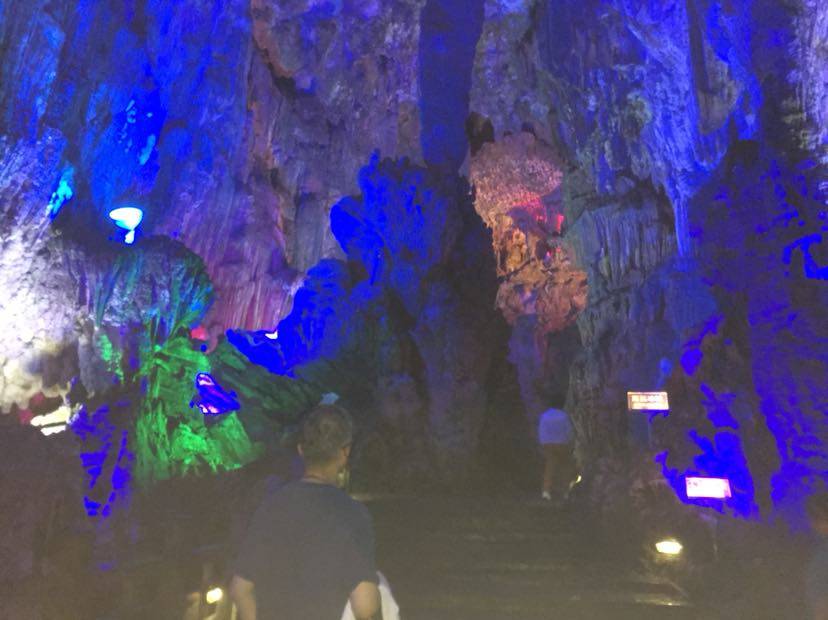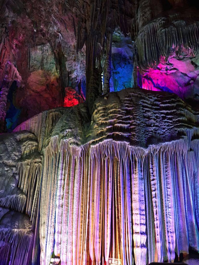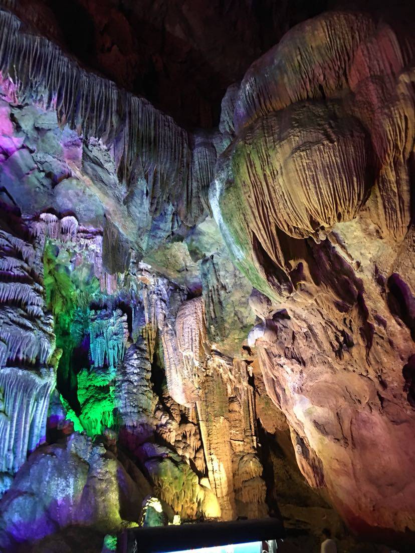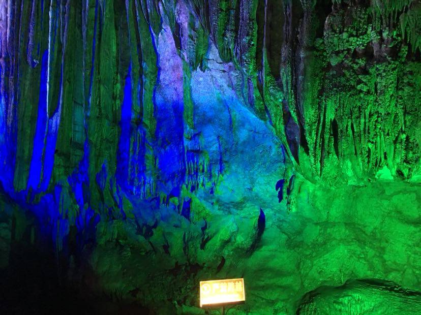 刚一进洞,看见的就是荔浦芋王,一个大大的石钟乳石在地上;过了一会,溶洞上方出现了一个孔雀的样子,这就是孔雀迎宾。还有一个像小猴的石钟乳,导游称它为生命之源;再往前走一段路,就是森林公园,映入眼帘的是一片绿油油的世界。艺术长廊中,千奇百怪的石钟乳到处都是;走了一会儿,一个很大的“冰淇淋”出现在我眼前,看起来非常好吃。过了一会就到了音乐宫;瑶池仙境;那里的石钟乳各式各样,还有一个大池塘,哪里的水清澈见底,把石钟乳倒映在水中,是多么梦幻……