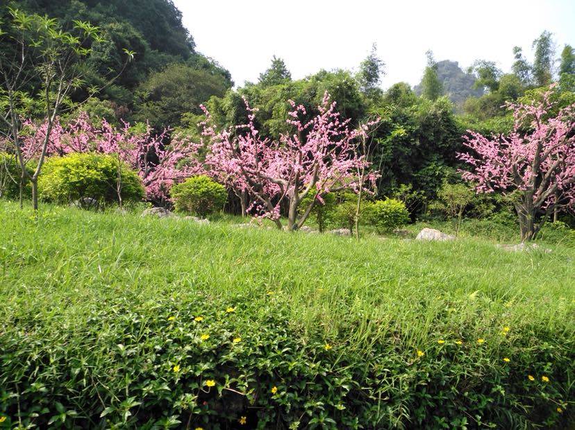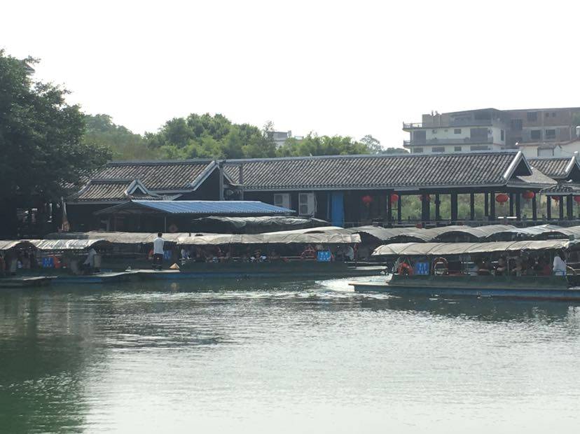 我们乘坐船的游慢慢地开动了,岸上的少数民族建筑离我们越来越远,我看到了种在水边的青绿色的杨树和大片大片的的绿草,在远处可以看见连绵的山峰,而在船的左边是水车和一些建筑。再看看右边,那一座山就像一只骆驼,所以这一景叫骆驼过江。远处,那越来越近的擂鼓呐喊声,时断时续,游船走近当年土族人居住地,展现土族人的表演,紧接着穿过一个很黑的天然形成的洞穴。刚进洞时有阳光的照射还不是很暗,再走一段就伸手不见五指,还好洞很短一下子就看见阳光和满树挑花,夏季哪来的桃花,当然是人造挑花。