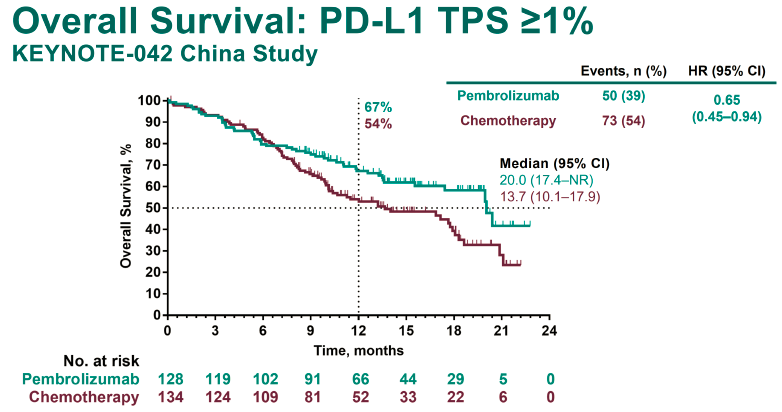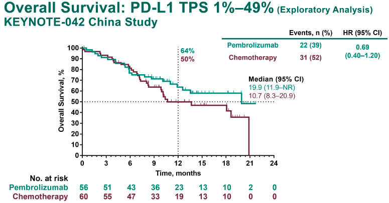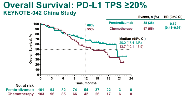 KEYNOTE-042中国人的数据显示,相比化疗,一线使用K药单药治疗的患者生存时间得到了延长,毒副作用低,生存质量也了保障。