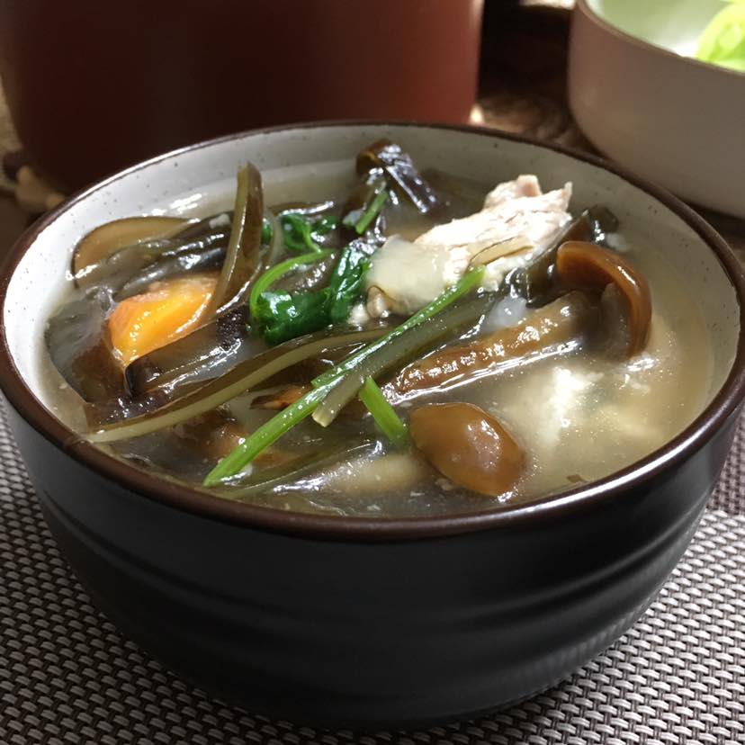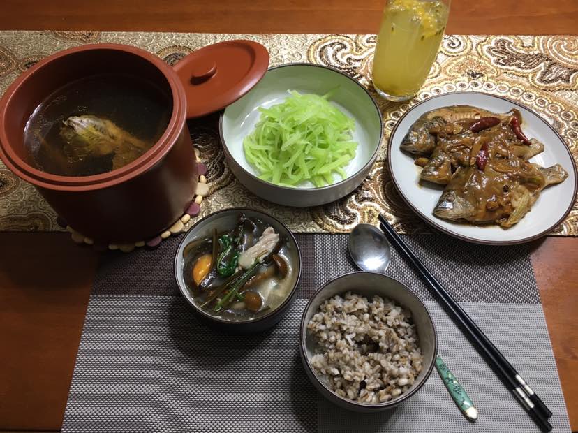 今天孩他爹给我淘了几个鸽子,收拾好后煲汤。晚餐:隔水炖盅灵芝鸽子汤/红烧海鲫鱼/橄榄油拌莴笋/肉片肉皮什锦菜汤:海带/老黄瓜/佛手瓜/胡萝卜/菜花/滑子菇/青稞米/百香果水