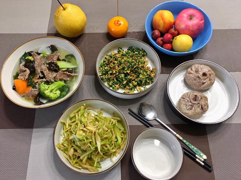 早餐:牛肉木耳西兰花炖胡萝卜老黄瓜油菜/莴笋叶炒蛋/拌青萝卜/荤香杂面包子