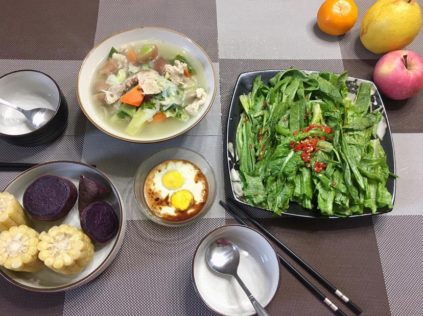 早餐:土豆肘子肉炖胡萝卜小白菜/剁椒麦菜/蒸蛋/紫薯玉米/水果