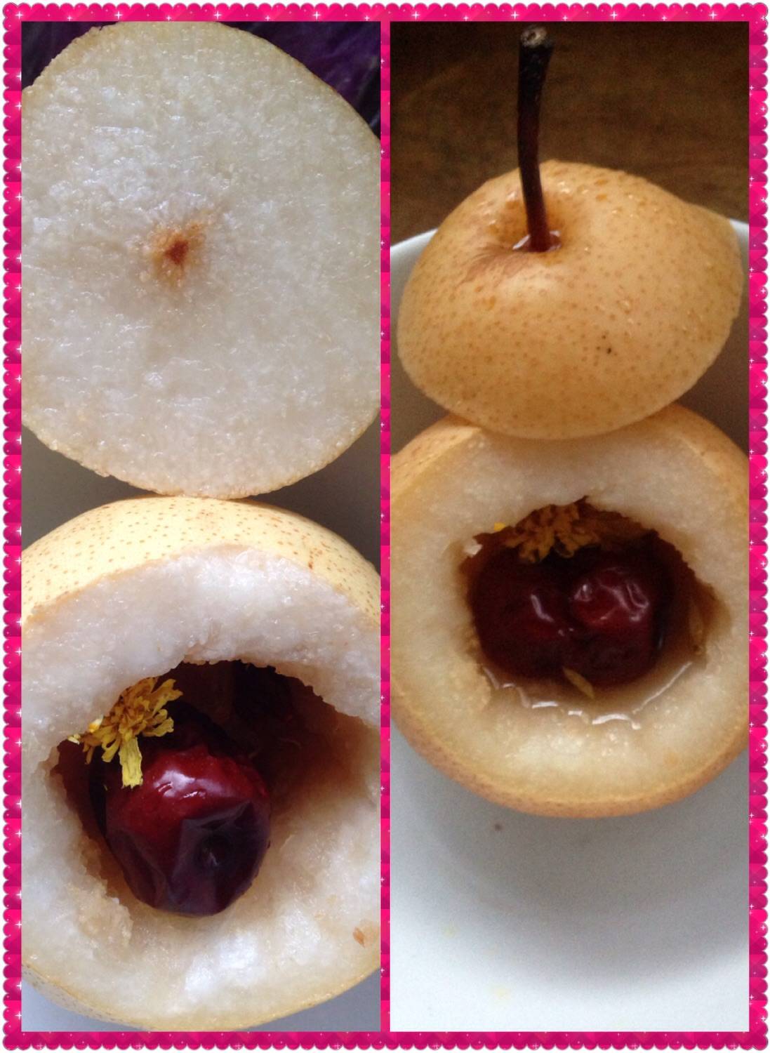 我爸爸以前在的时候冬天都这样给我蒸梨吃。润肺的。就切开把梨核挖掉。里面放红枣。枸杞。冰糖。菊花是我自己加的。因为想着枸杞配菊花清火明目据说还补肾。