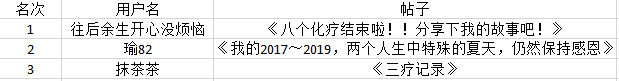 恭喜以上两位姐妹!!!以下是最佳帖子前三名榜单!