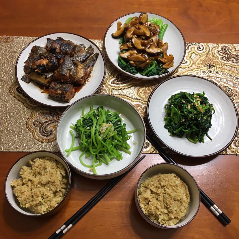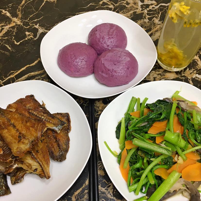 早餐:香煎沙丁鱼/紫薯馒头/百香果水/素炒什锦:平菇/菜心/胡萝卜/茼蒿/菠菜