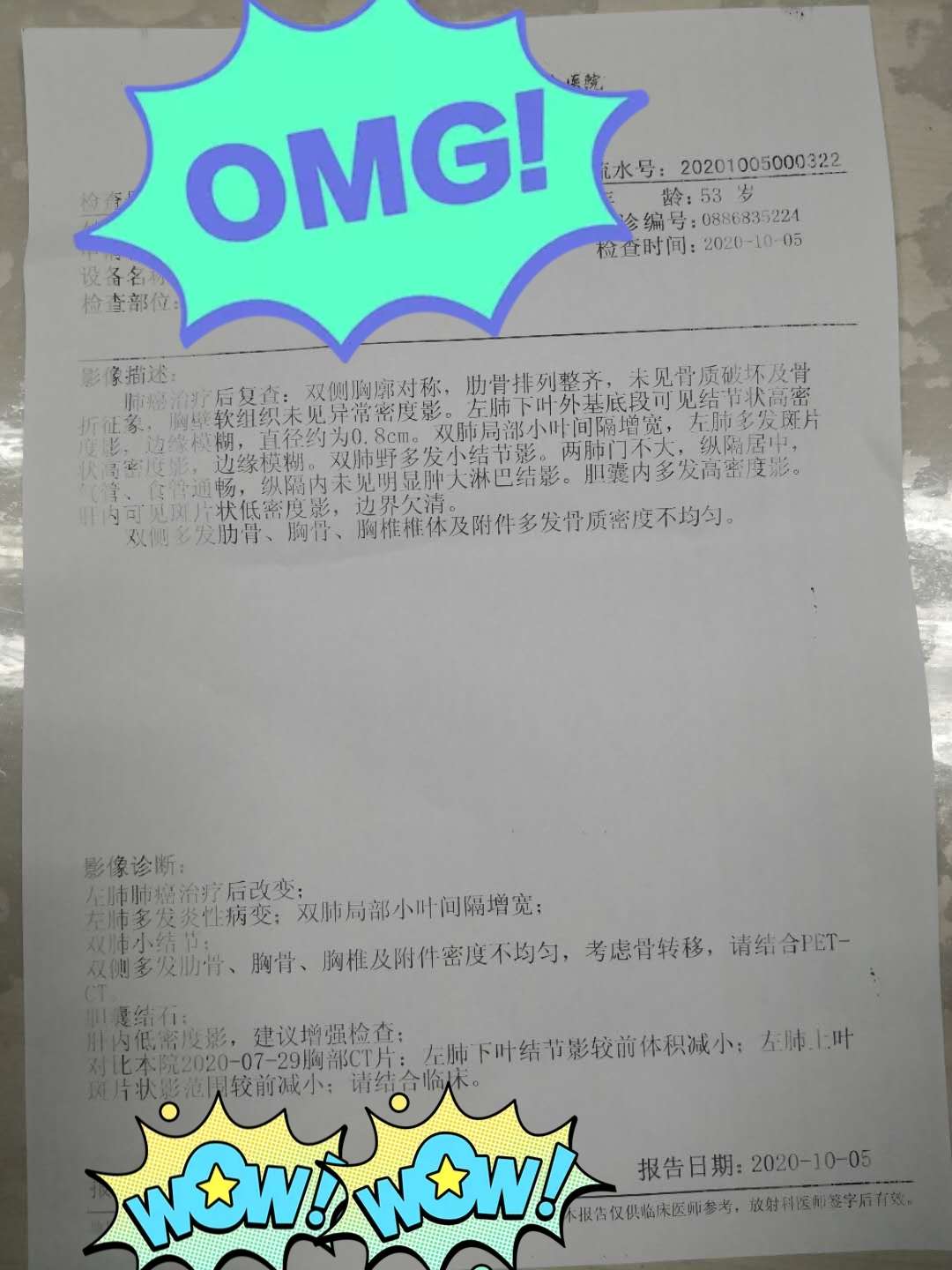 2019年11月11日,新方案的第三次复查,标记物均正常。肺部肿瘤减小至3.5*2.0。心包积液与前相仿,双肺门小淋巴结增长至1.0。现在有点担心这个小淋巴结是个什么东西了,不过医生又强调不用管。