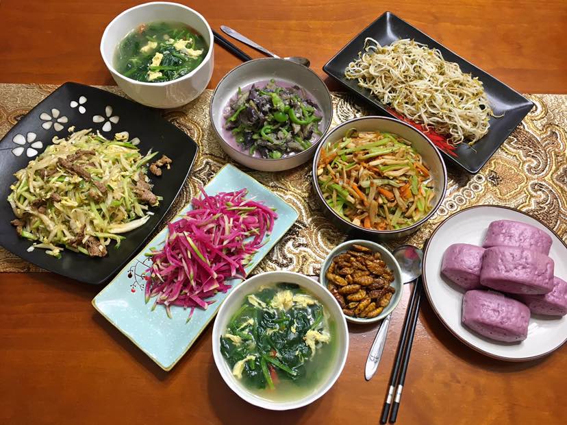 早餐:醋拌心里美萝卜/家拌凉菜:白菜、红薯粉、黄瓜、肉丝/手撕杏鲍菇炒胡萝卜芹菜丝/虾皮菠菜鸡蛋西红柿汤/素炒绿豆芽(自己发的)/蒜蓉茄子拌青椒/蚕蛹/紫薯馒头/大约18种食材,我做素炒菜时基本都用姜葱蒜爆锅,这样比较有味道。具体做法姐妹们可以根据自己的烹饪方式去做,可以借鉴一下我的配菜,我主张每一样食材都放点,这样均衡下来可以达到营养标准,晚餐吃几样水果和坚果就很容易达到20多种食物,今天的营养就够啦😄一起加油姐妹们!棒棒哒👍