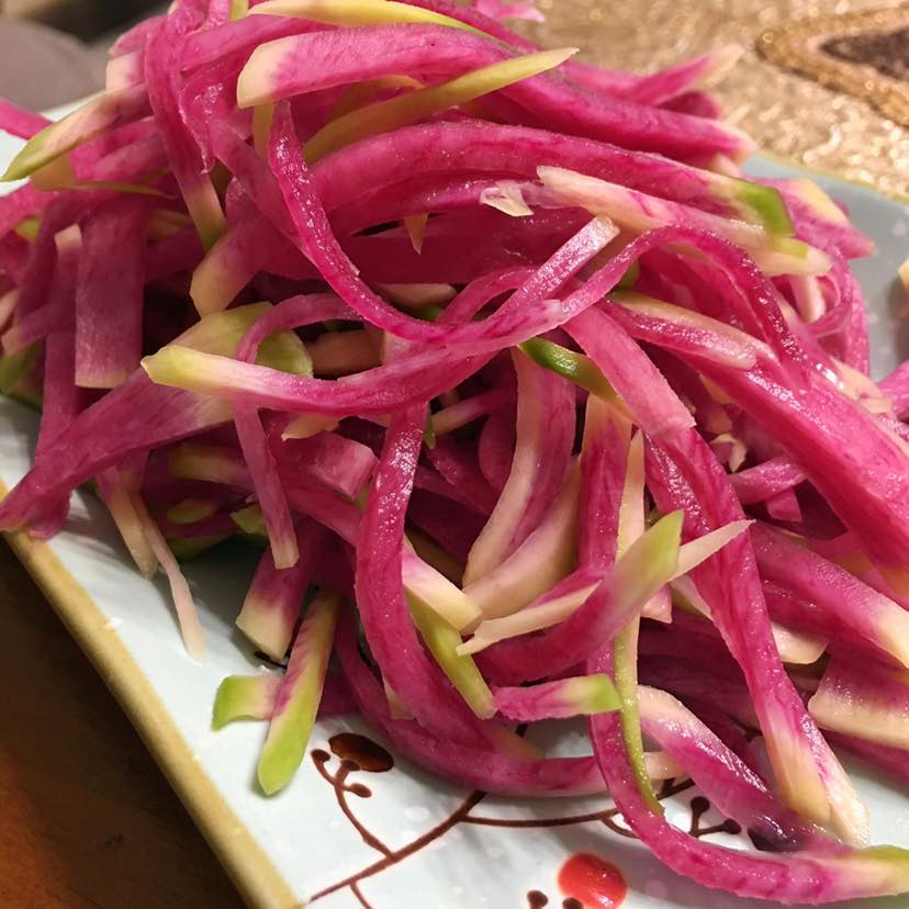心里美萝卜,外皮呈绿色,里面呈鲜艳的玫红色,颜色非常漂亮,由此而得名,在我国多地有产。其皮薄肉脆、多汁,多以凉拌食用,有生津止渴的作用。所含热量较少,纤维素较多,吃后易产生饱胀感,有助于减肥。还有下气、消食、除疾润肺、解毒生津、利尿通便的功效。
